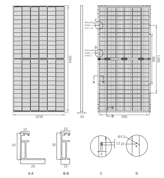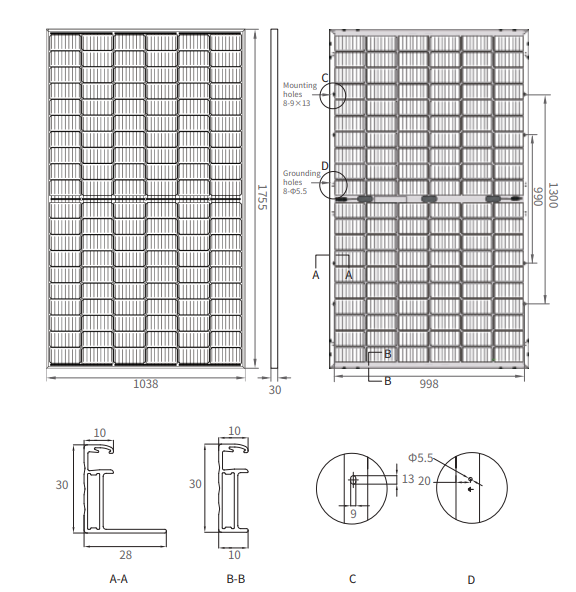 - Konstrukcja MBB i half-cut redukuje efekty cienia, poprawia niezawodność modułu i zmniejsza straty w produkcji prądu.